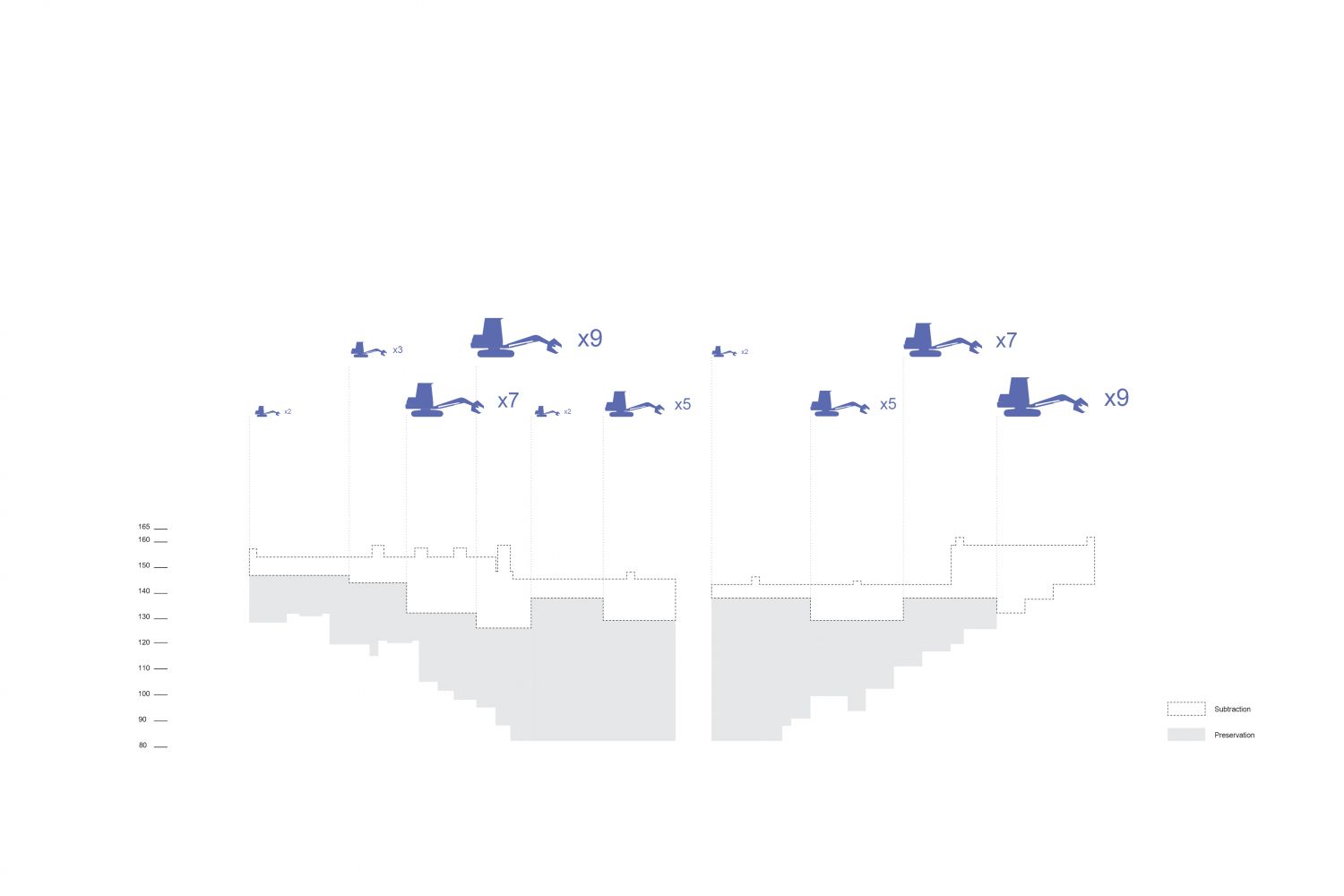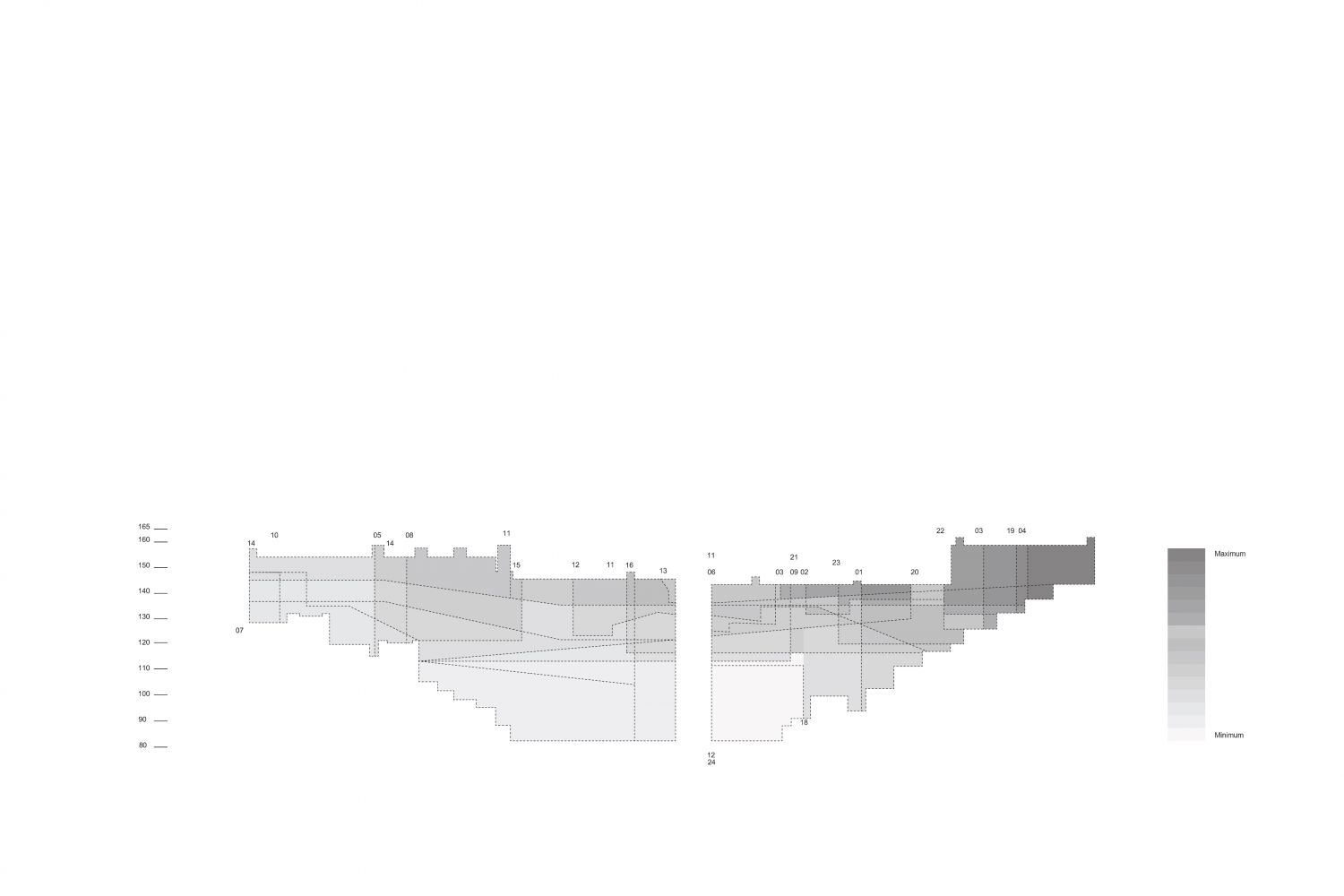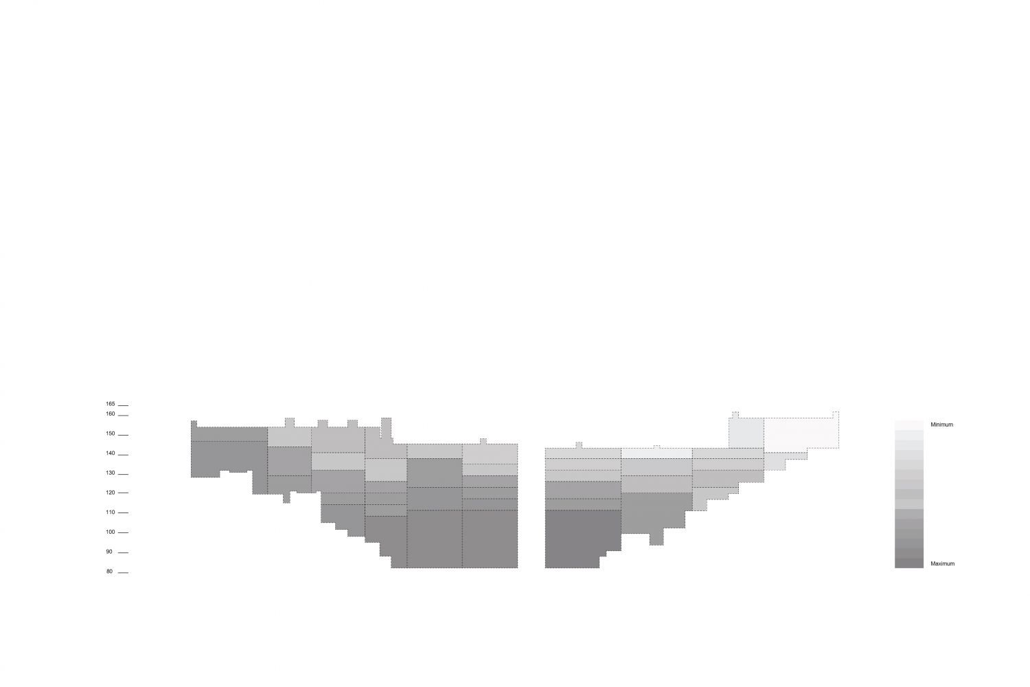 At the building scale, the mass of the Diga is seen as a problem: its foreshortened perception obstructs the visual field. By rendering the recurrence of building parts that interfere with the views, we define a system that ranks areas of punctual subtraction, thus creating a gradient of visual permeability. The structure is analysed to identify the possible geometry of demolition. The dilatation joints break down the seemingly solid construction in several independent sections. The vacancy and he status of properties quantify the amount of spaces to take down.