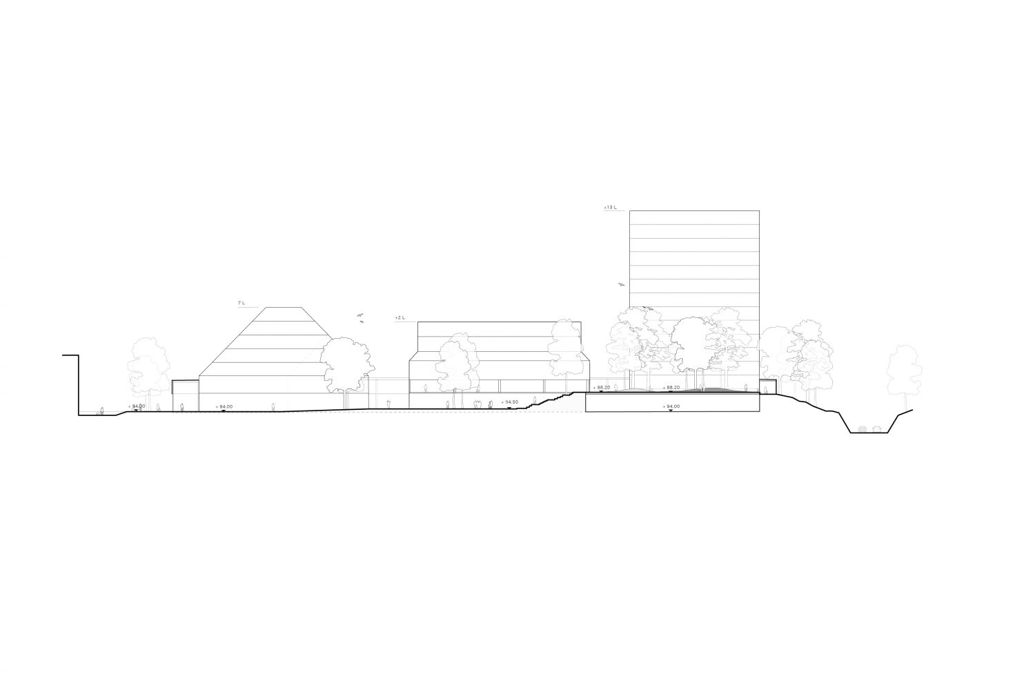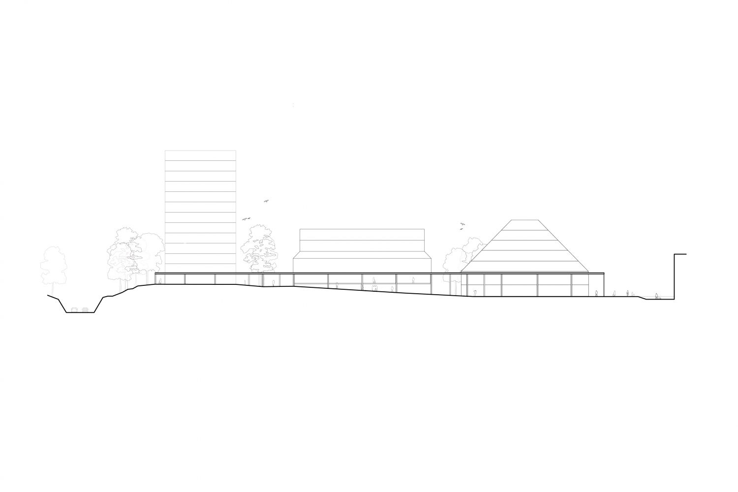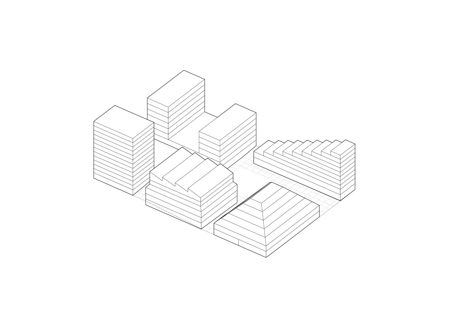 The framing of the existing objects on the field allows outlines a new urban arena and fosters the transformation of the existing buildings. Within a scenario of city growth, the site develops further, increasing its density in terms of building mass and program. The new buildings intensify the activities on the site and offer a wide range of housing typologies together with retail spaces on the ground floor.