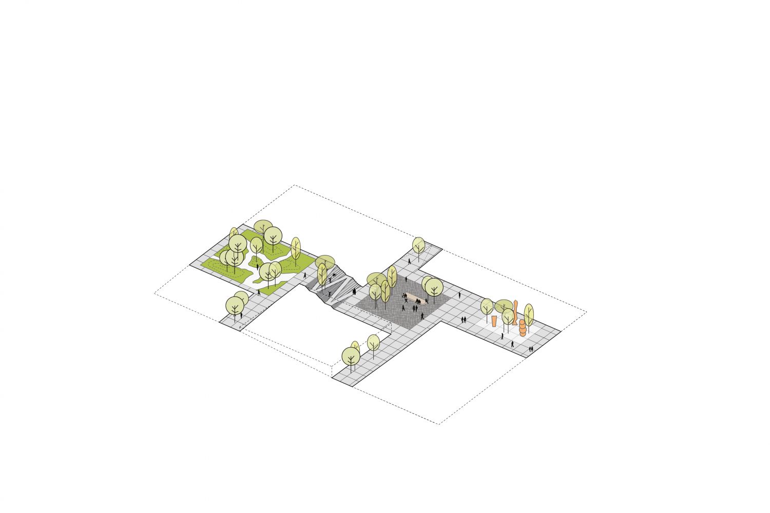 Defining the field of growth through the enclosure allows the space to acquire a distinct symbolic meaning and value. Along with the insertion of new architectural objects, the framed open space will undergo a further transformation: from being a rather informal space, both in character and activities, the area will become a proper civic square that could combine a representative quality with a degree of flexibility. The uniform and isotropic nature of the ground will perform as a stage for temporary activities and as a place of collective gatherings and public events.