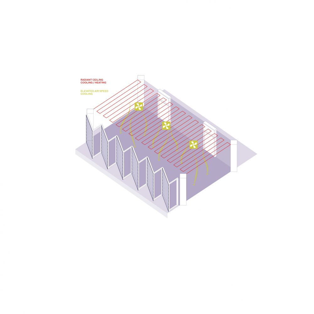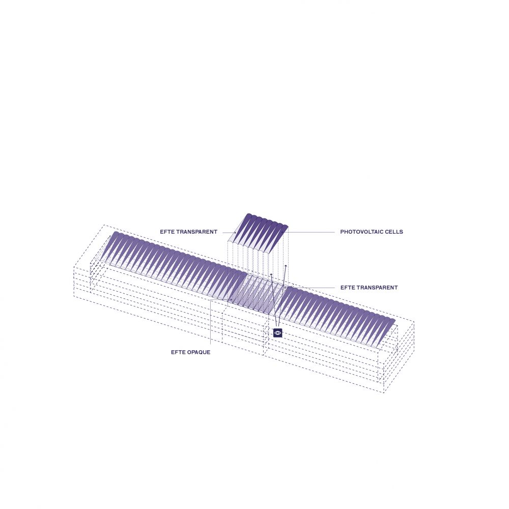 Likewise, the roof design aims to minimize the solar gain while maximizing the light into the atrium, thanks to a thoughtful cushion design using transparent EFTE layers and photovoltaic cells integrated on the south facing parts.