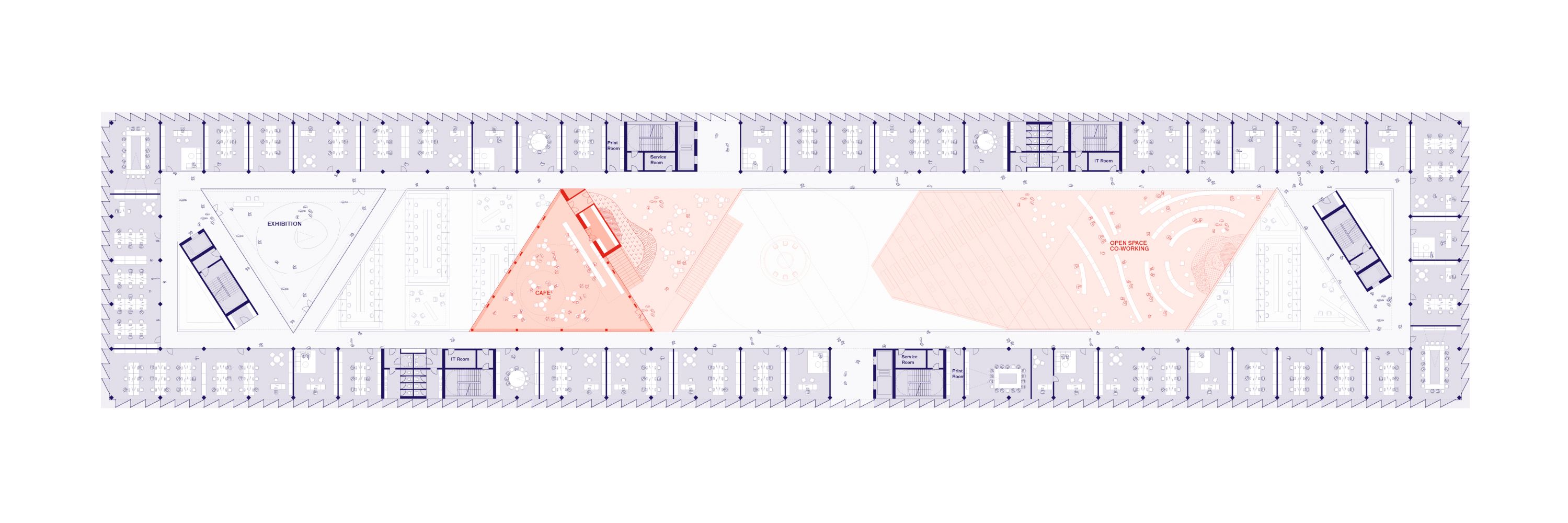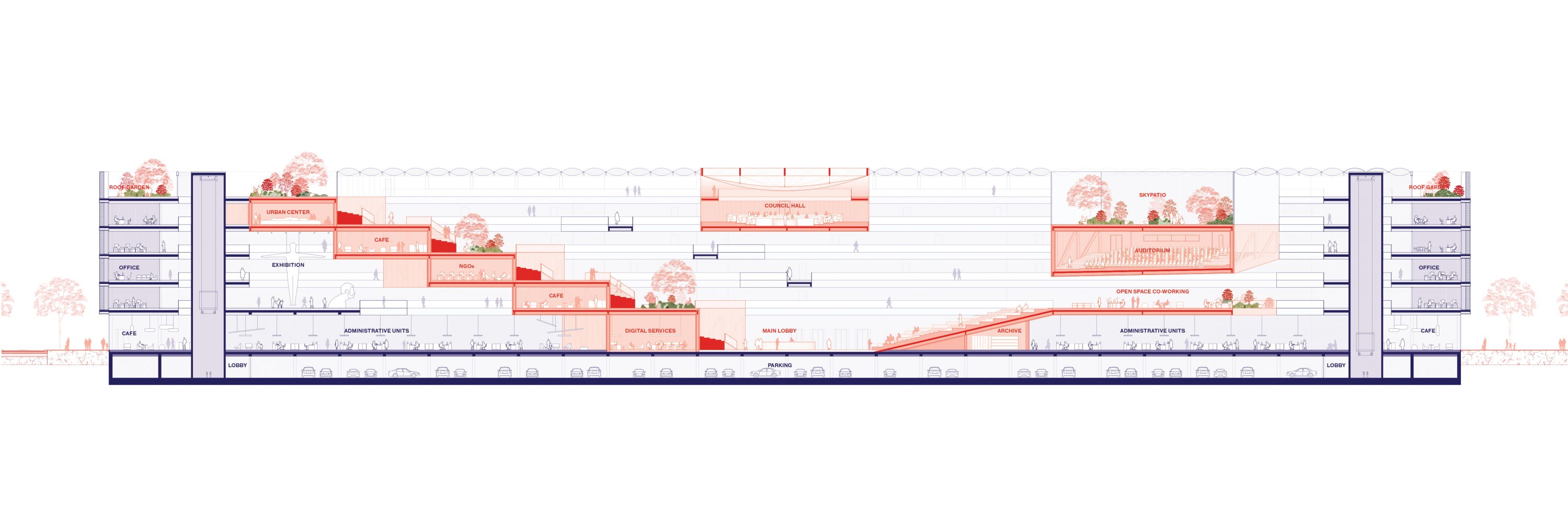 The atrium is composed by extroverted and interconnected volumes that provide space for a dynamic set of functions for both the city administration and the public. Here, educational and cultural initiatives foster active participation, curiosity, diversity and exchange, thus reaffirming the role of the city as an active and engaged member of the community in which it was founded. Each space is designed explicitly to its uses and the proposed spatial arrangement creates an interiorised urban intensity that encourages interactions, promotes exchanges of information and encounters of various sort.