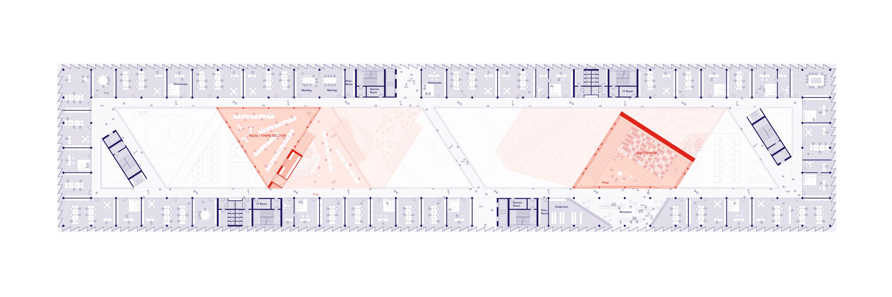 The New City Hall is located on one of the intersections along the New Boulevard. Given the importance of the building for Tirana, this space is enlarged to become a simple square of 200x200 meter, substantially more prominent than the other envisioned public areas along the boulevard. The New City Hall engages with these site conditions. It maximises the exchange with the boulevard and outlines a uniting volume that defines a coherent backdrop for the new public space. The possible minimal repositioning of some volumes along the West side of the boulevard, facilitates a more effective connection to the programmed ‘World Park’, while on the other side the public space penetrates the building through the collective atrium, all the way up to the roof.