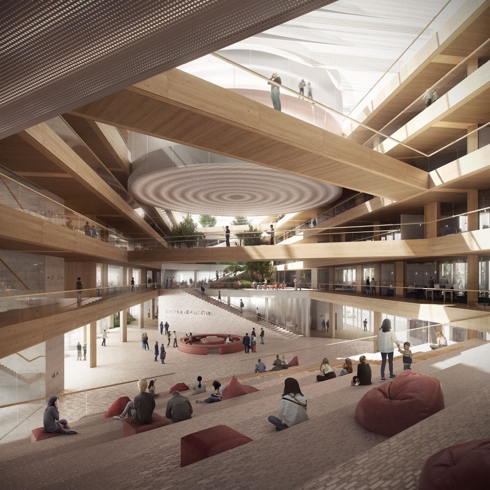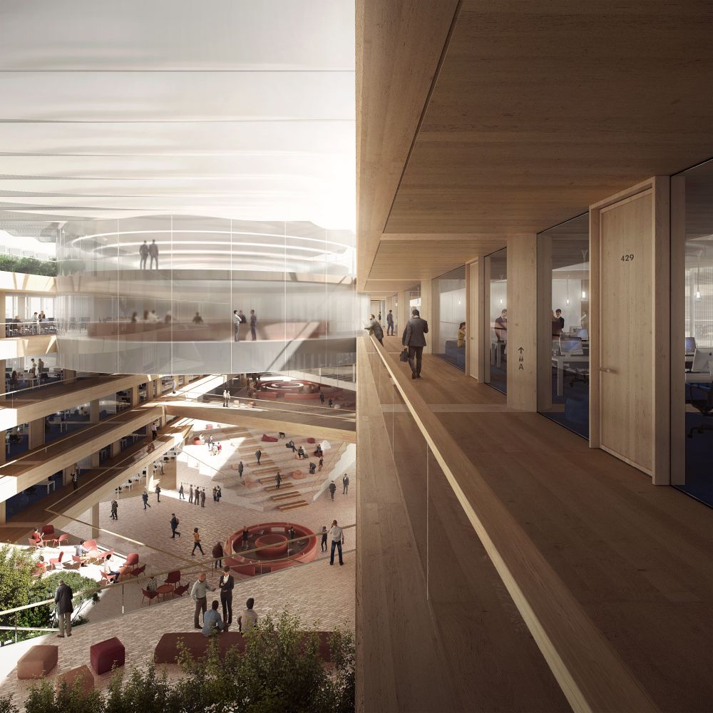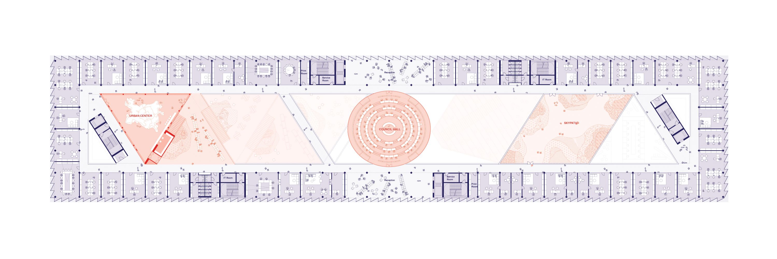 The main structure of the building presents itself as a rational and transparent grid, built to work efficiently and communicate clearly. The linear arrangement of the workspaces and their amenities define a flexible floor plan that can change over time, according to the departmental needs. The floor grid, in combination with smart flooring solutions, allows the areas to be fitted out as cellular offices, open-plan offices, activity-based offices, and anything in between. The coherent accessibility fosters interaction with the administrative environment and creates a feeling of increased agency for the citizens. The office floors are organised around a full-height central atrium that provides light deep into the centre of the building.