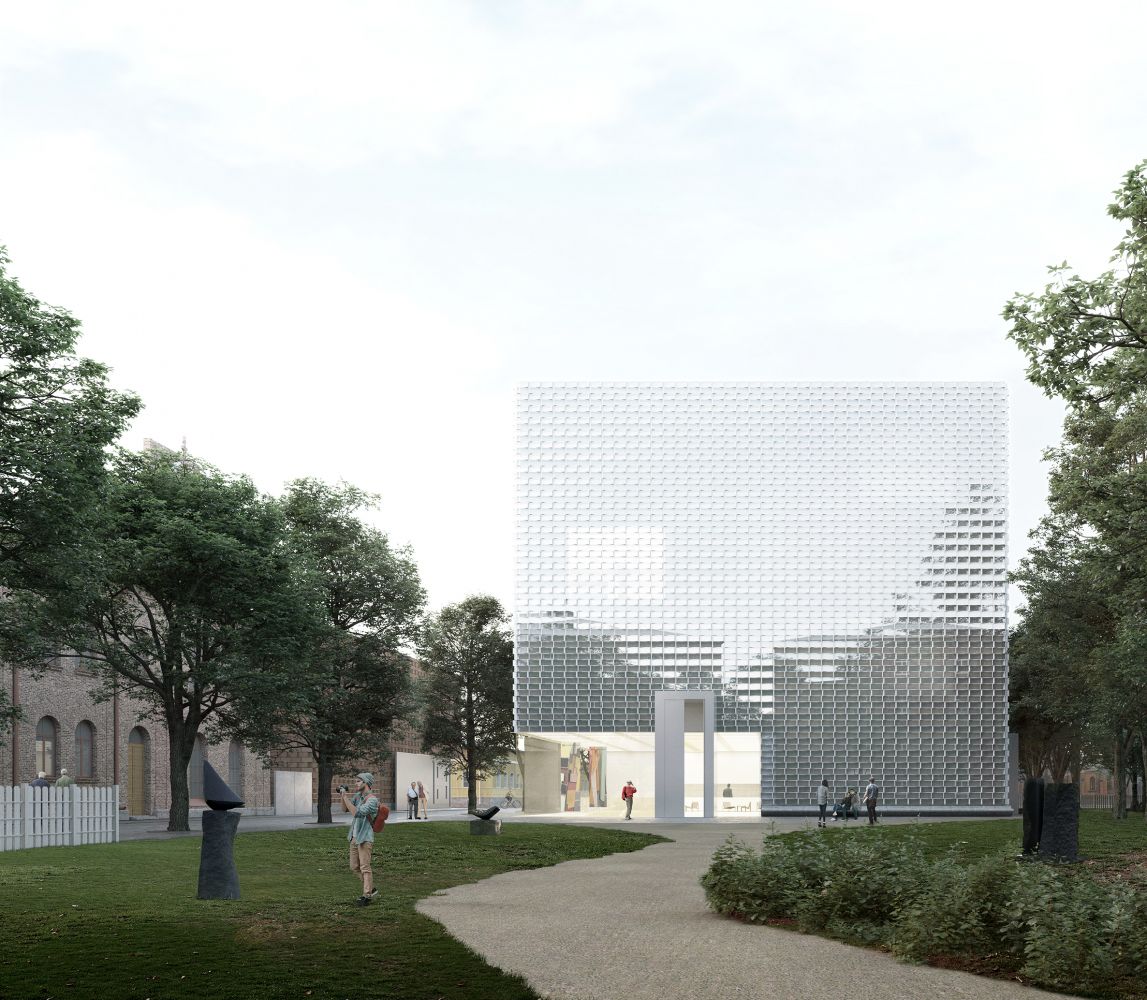 The distinctive element of the Sara Hilden museum is the façade, designed to echo the brickwork of the historical context. The Facility Building features a perforated brick lattice providing a screen through which interior lights glow at night. The Art Museum employs glass brick that evokes a former greenhouse and defines a shimmering, ambiguous presence in the neighborhood.