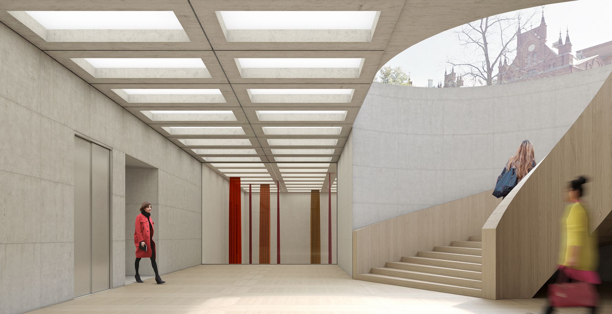 The Art Museum sits on the historic city park while preserving the surrounding trees. The compact self-standing volume resonates with the urban disposition of the neighboring public buildings — the Finlayson Church and the Palace. The resulting entrance square preserves the historical sightline between the Headquarters and the Palace while underling the significance of the new institution in the area. This open space is envisioned as the outdoor extension of the museum, hosting part of its sculptures. It also services the Finlayson Art Area for temporary open-air public events.