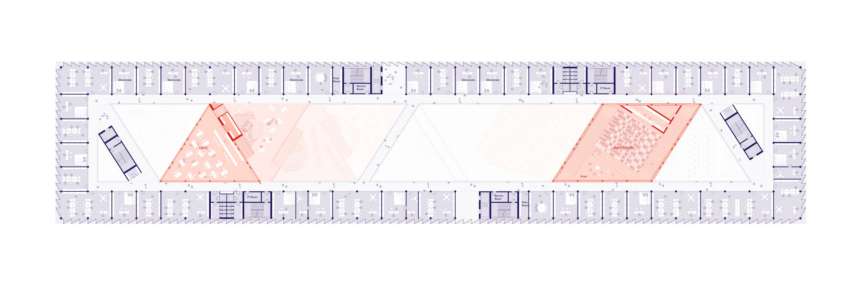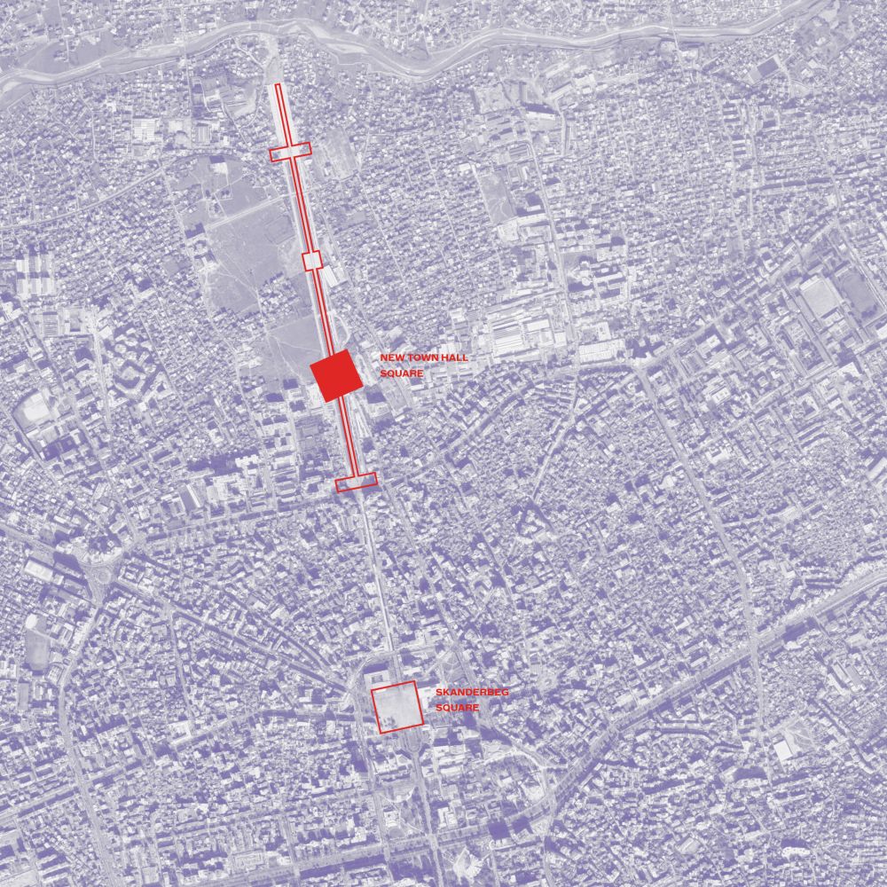 The New City Hall is located on one of the intersections along the New Boulevard. Given the importance of the building for Tirana, this space is enlarged to become a simple square of 200x200 meter, substantially more prominent than the other envisioned public areas along the boulevard. The New City Hall engages with these site conditions. It maximises the exchange with the boulevard and outlines a uniting volume that defines a coherent backdrop for the new public space. The possible minimal repositioning of some volumes along the West side of the boulevard, facilitates a more effective connection to the programmed ‘World Park’, while on the other side the public space penetrates the building through the collective atrium, all the way up to the roof.