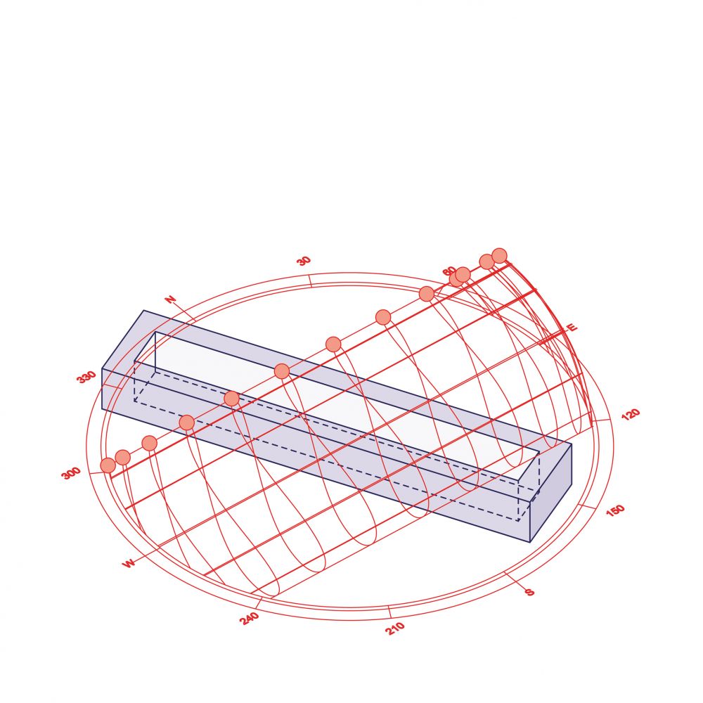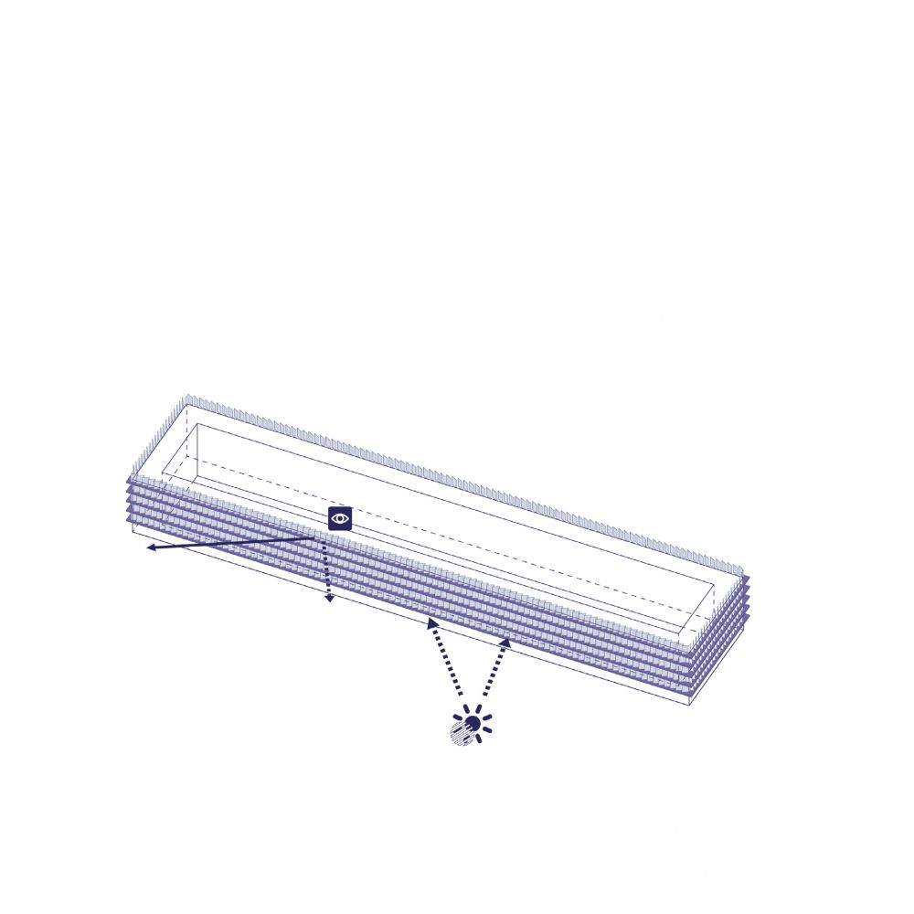 The design of the building envelope is strongly based on the bioclimatic principle of reducing solar irradiation on the façade, while enabling light and open views towards the surroundings. A slight differentiation on the tones of the metal cladding increases the abstraction of the mass, distinguishing itself from the corporate appearance of conventional glazed buildings. The resulting facade reverberates. Depending on the view angle, or the time during the day, the building appears differently.
