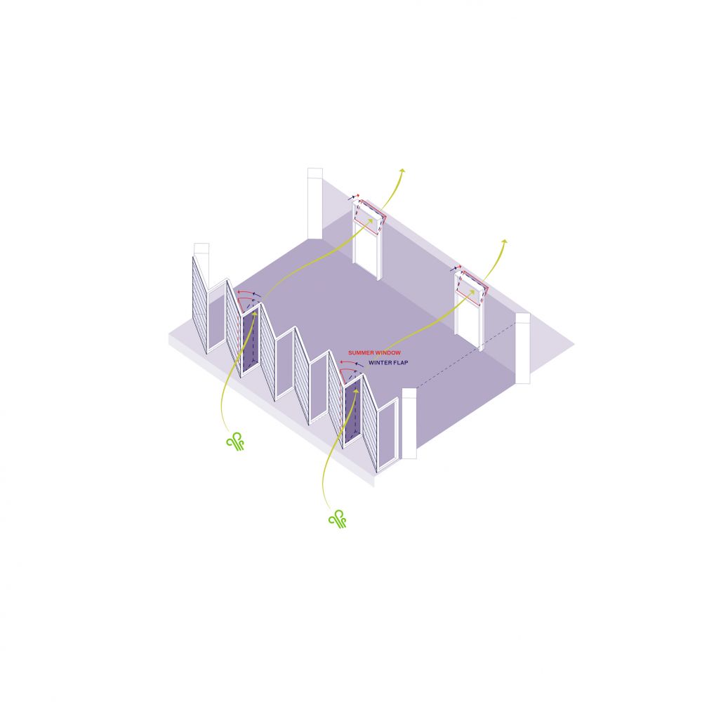 Likewise, the roof design aims to minimize the solar gain while maximizing the light into the atrium, thanks to a thoughtful cushion design using transparent EFTE layers and photovoltaic cells integrated on the south facing parts.