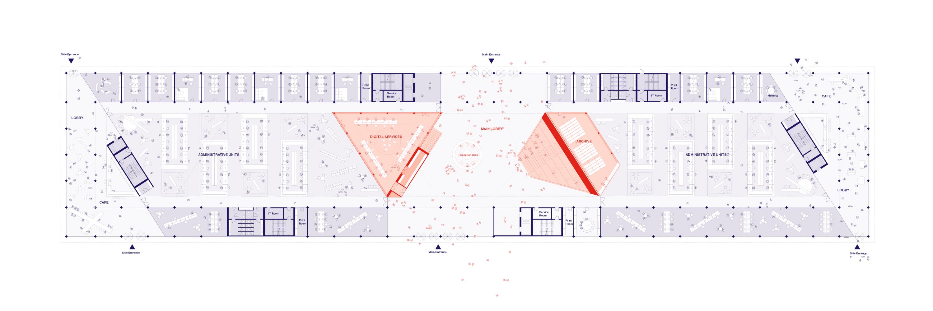 The main structure of the building presents itself as a rational and transparent grid, built to work efficiently and communicate clearly. The linear arrangement of the workspaces and their amenities define a flexible floor plan that can change over time, according to the departmental needs. The floor grid, in combination with smart flooring solutions, allows the areas to be fitted out as cellular offices, open-plan offices, activity-based offices, and anything in between. The coherent accessibility fosters interaction with the administrative environment and creates a feeling of increased agency for the citizens. The office floors are organised around a full-height central atrium that provides light deep into the centre of the building.