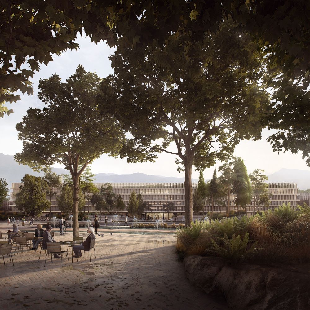The rocky surfaces of this cluster of hills evokes the mountainous landscape with local plants and indigenous trees that define a series of lavish gardens on the square. A real cut-out of nature into the cityscape. Some of the hills are programmed for various uses such as a stage, a fountain or a skate-park. Others hide interior functions, such as the bike storage, the underground parking entrance, the tourist info point, the cafe and the connected services. The square becomes an extension of the New City Hall with complementary activities.