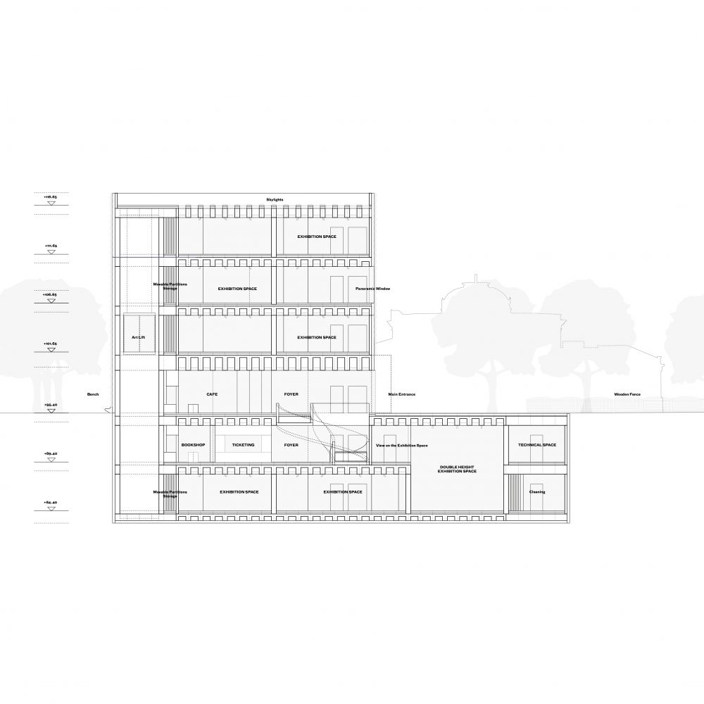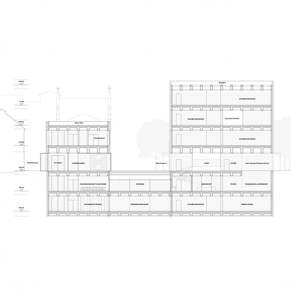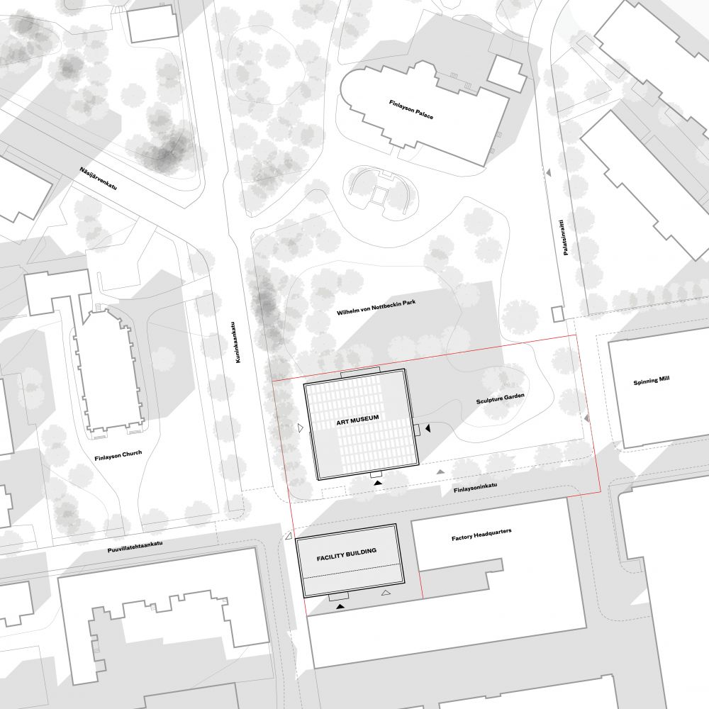 The Art Museum sits on the historic city park while preserving the surrounding trees. The compact self-standing volume resonates with the urban disposition of the neighboring public buildings — the Finlayson Church and the Palace. The resulting entrance square preserves the historical sightline between the Headquarters and the Palace while underling the significance of the new institution in the area. This open space is envisioned as the outdoor extension of the museum, hosting part of its sculptures. It also services the Finlayson Art Area for temporary open-air public events.
