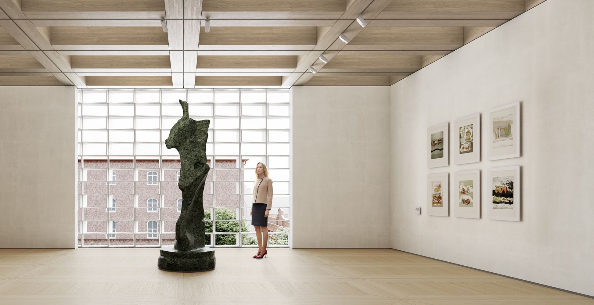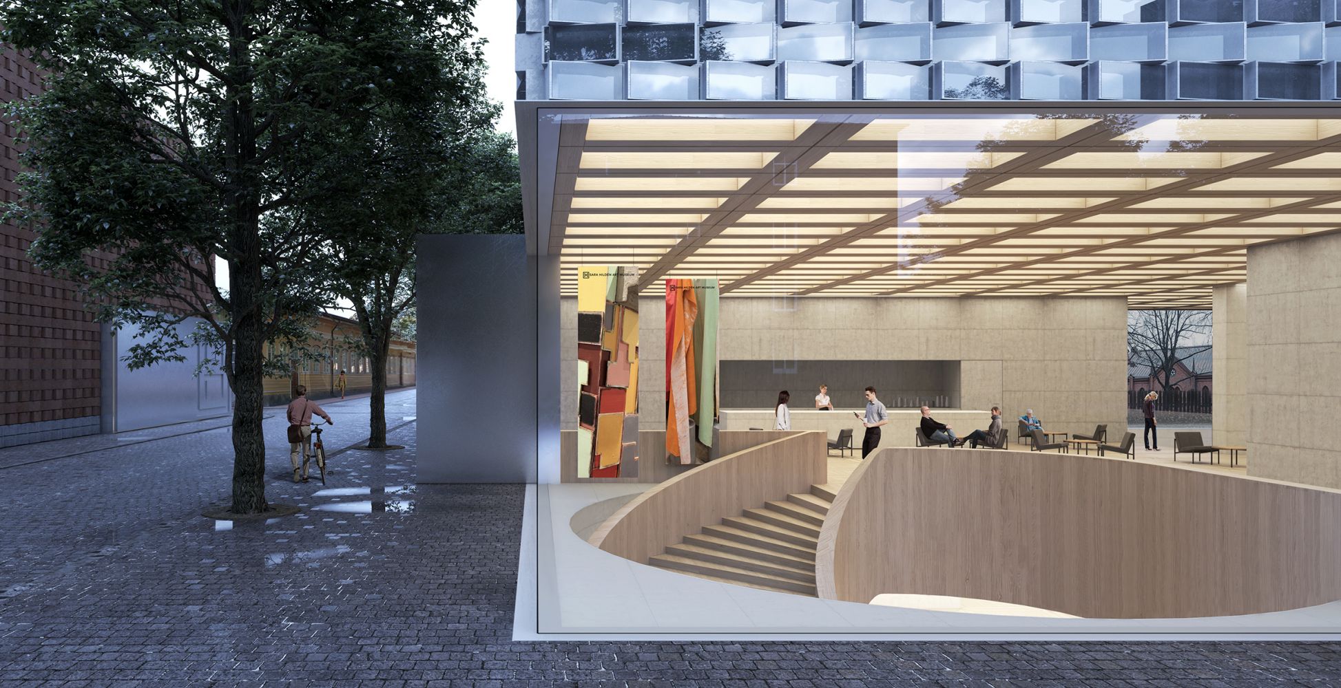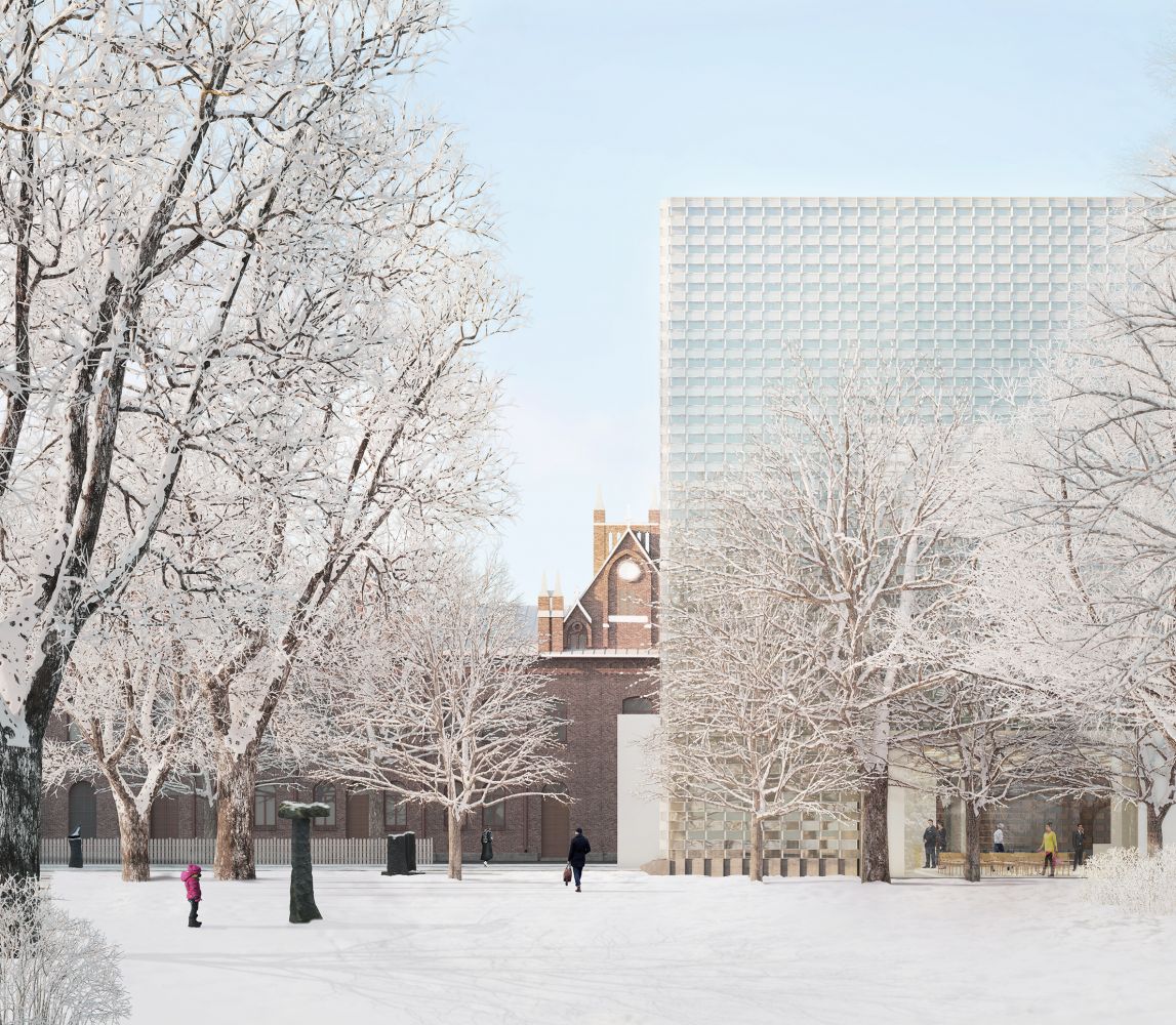 The Art Museum sits on the historic city park while preserving the surrounding trees. The compact self-standing volume resonates with the urban disposition of the neighboring public buildings — the Finlayson Church and the Palace. The resulting entrance square preserves the historical sightline between the Headquarters and the Palace while underling the significance of the new institution in the area. This open space is envisioned as the outdoor extension of the museum, hosting part of its sculptures. It also services the Finlayson Art Area for temporary open-air public events.