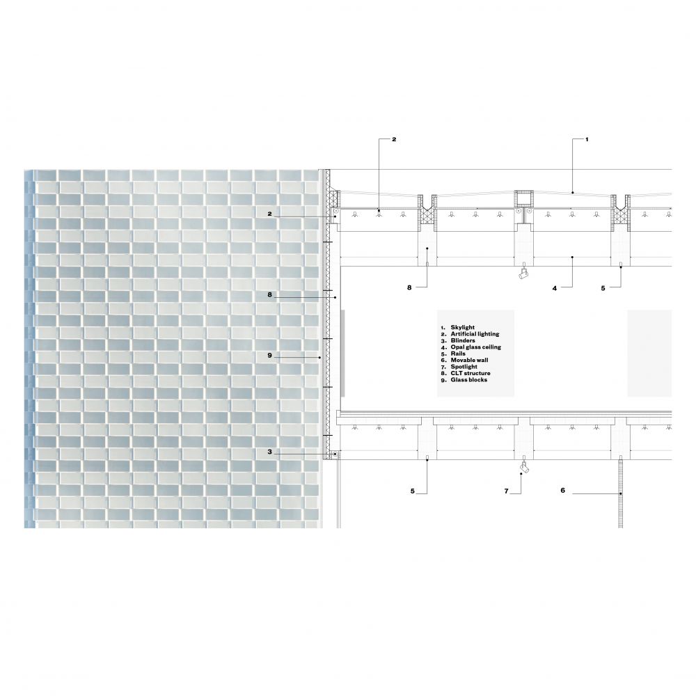 The exhibition rooms are based on the structural module of 1,25 x 2,50 m and meet the required dimensions of 125 sqm. Nonetheless, the spaces differ in height (4 to 9m) and light conditions — no light, lateral light, skylight through the roof. The openings can be filtered or closed thanks to the integrated darkening systems. Each room comprises a system of movable partitions (modules 1,25 x 4,00 m) that can create various layouts through rails on the ceiling, thus optimizing the use of resources for each show.