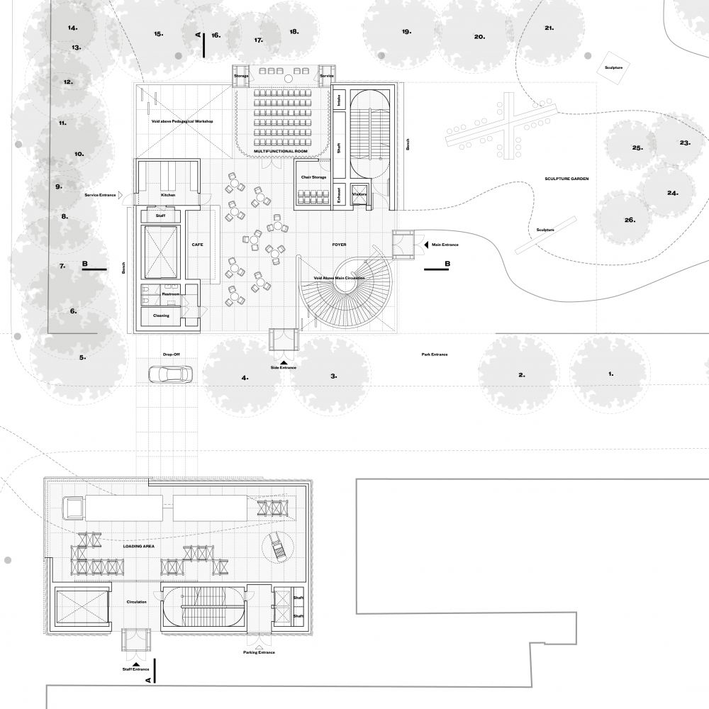 The public activities of the museum  — the cafe and the event space  — activate the ground level. They benefit from the views on the ever-changing colors of the park throughout the seasons. This area can be isolated easily and function independently outside the museum's visiting hours.