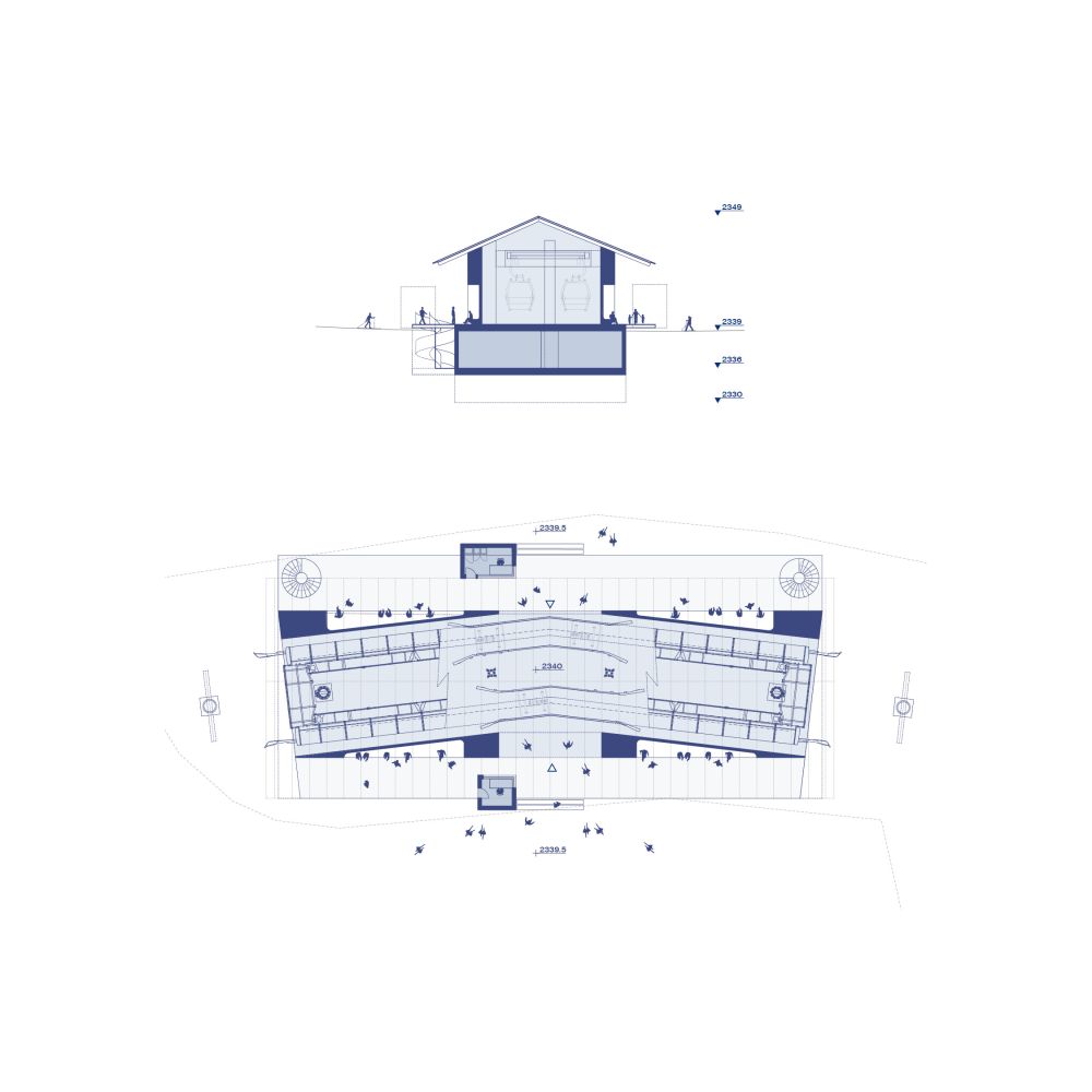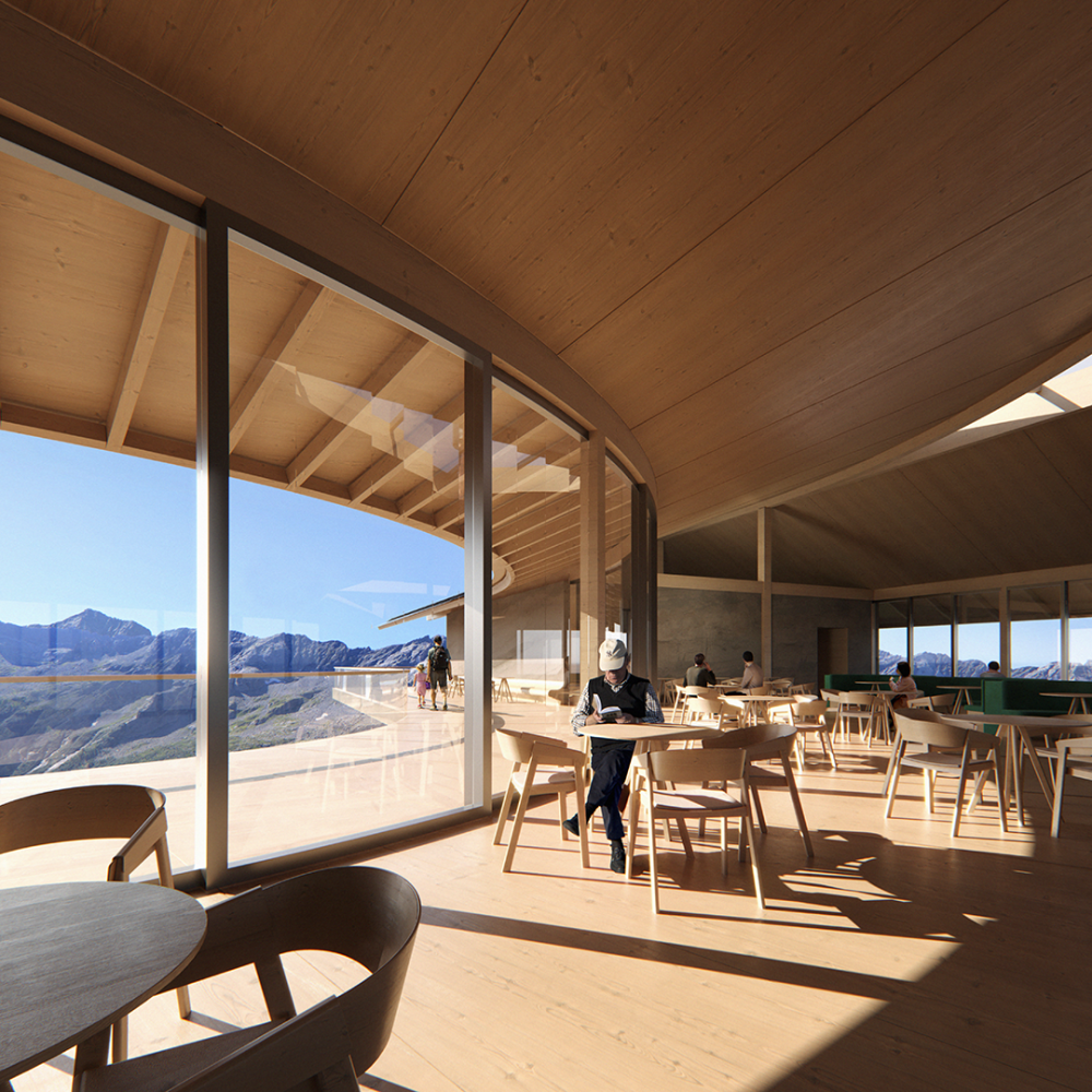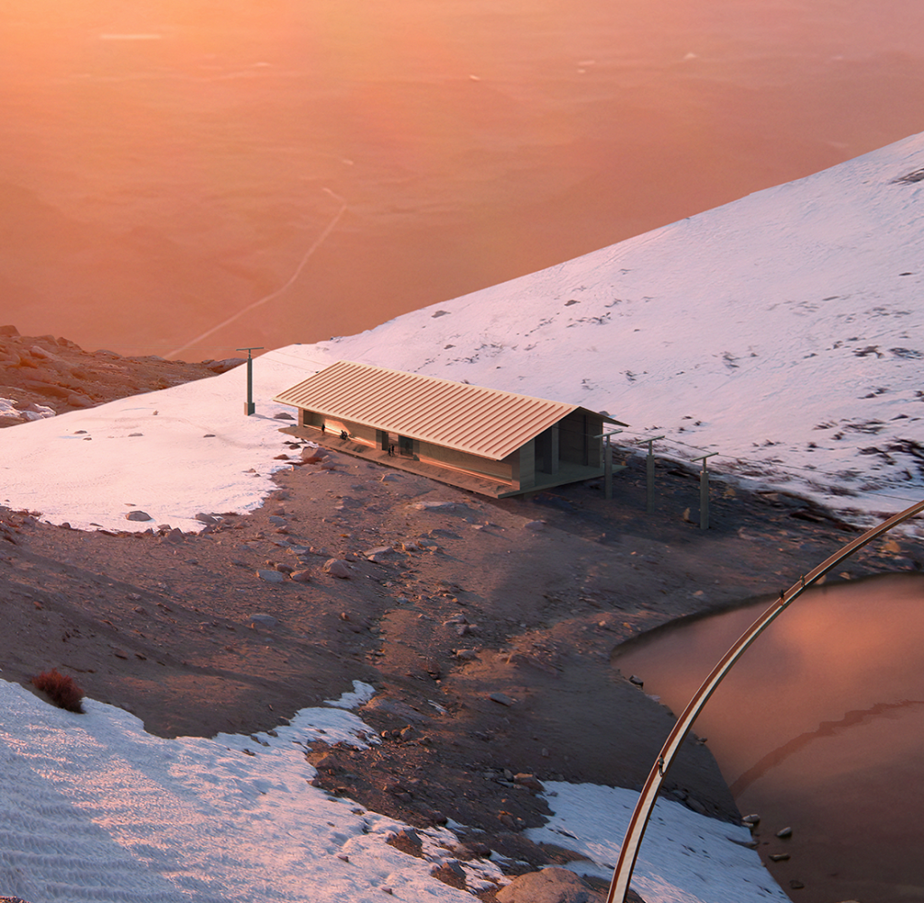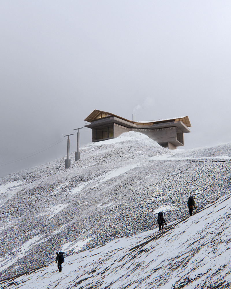 The identity for the new cableway aims to reconcile architecture and landscape, use and contemplation. From a place of transit, alien to its surrounding, this infrastructural typology becomes a place that builds relationships, inviting visitors to adapt to the slower pace of the mountain, beholding its magnificence and fragility.