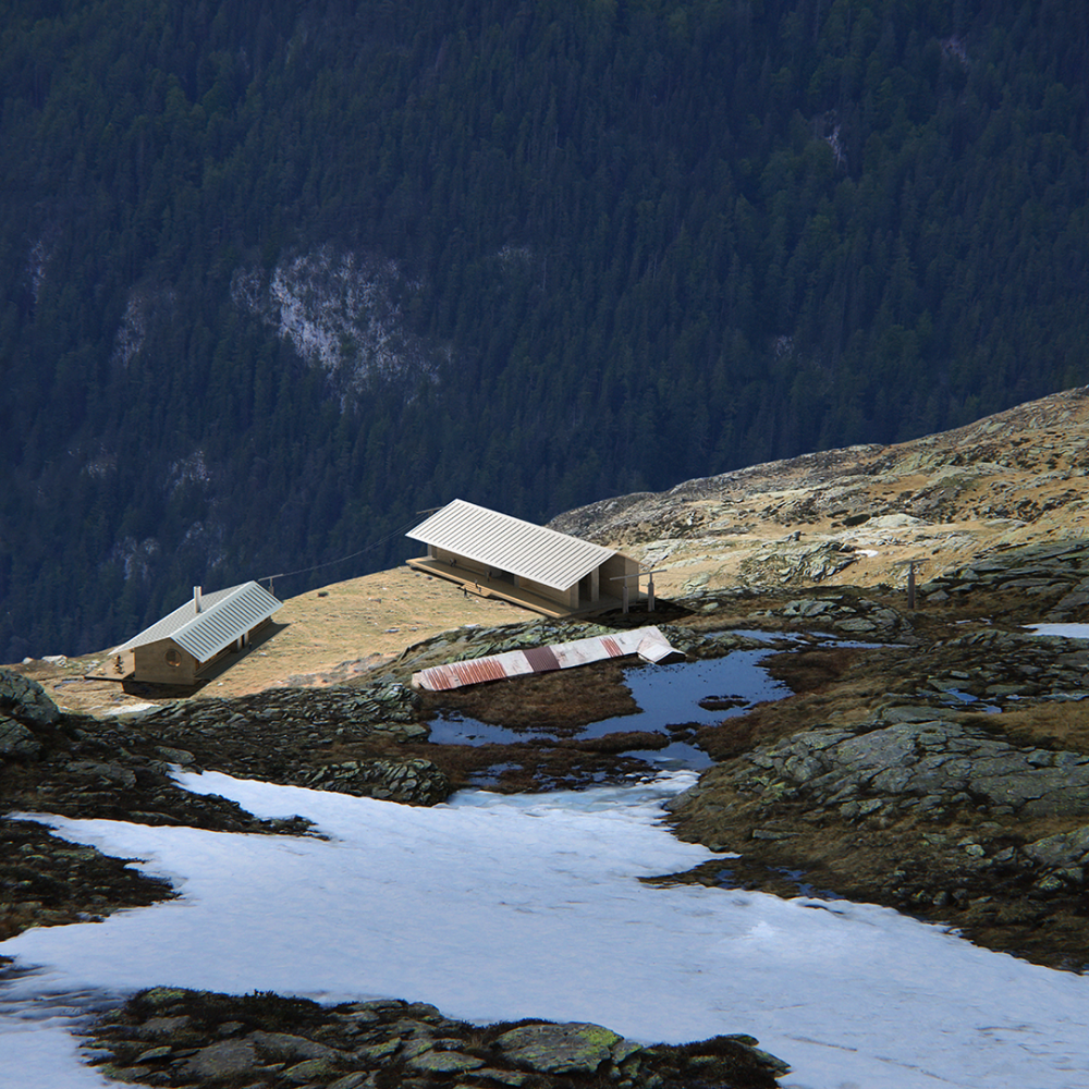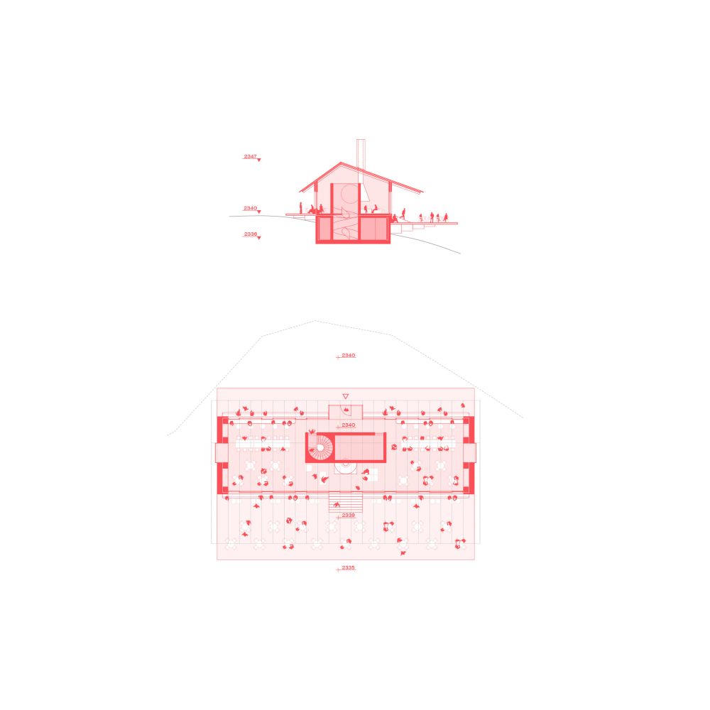 Alpine architecture comes from the construction and material tradition of a given territory and is composed of recurring functional devices that became symbolic over time.The pitched roof is the most recognizable element, conceived as a fifth elevation of the architectural volume, a thin line between earth and sky, able to offer shelter and at the same time generate unexpected moments of sociality. The protruding plane generates a generous space framing the landscape, while its geometric profile enhances the Alpine topography by contrast.